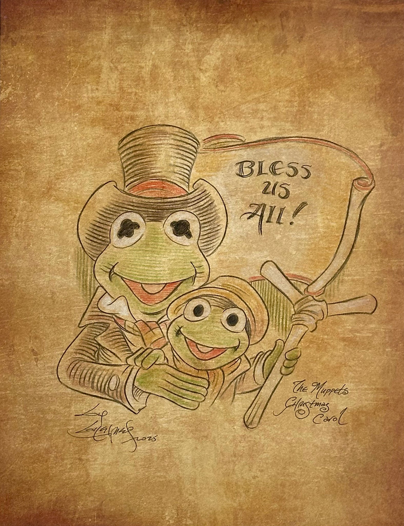 Kermit and Robin "Bless Us All" on Parchment - Guy Gilchrist Original